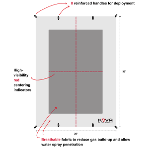Conçu pour isoler et contenir les incendies dans tous les véhicules électriques de tourisme et les petits véhicules industriels, le KOVA mesure 8,5 m × 11,5 m (28’ x 38’) et résiste à des températures allant jusqu'à 1650°C (3000 °F). Avec des poignées renforcées et des indicateurs de centrage rouges à haute visibilité, il assure une mise en place rapide et précise, donnant aux pompiers la confiance nécessaire pour contrôler rapidement les incendies de VE, protéger les environs et réduire l'exposition aux gaz toxiques.